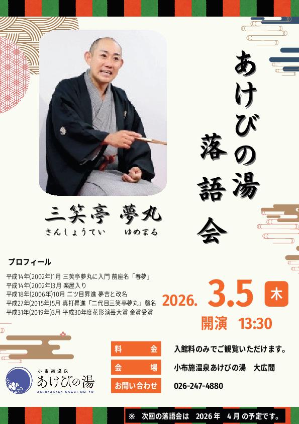 2026年3月5日13時30分よりあけびの湯落語会を開催致します。